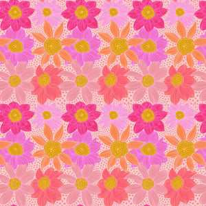 Pattern of pink and orange flowers with yellow centers on a light pink background