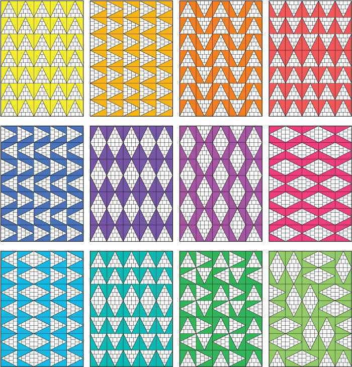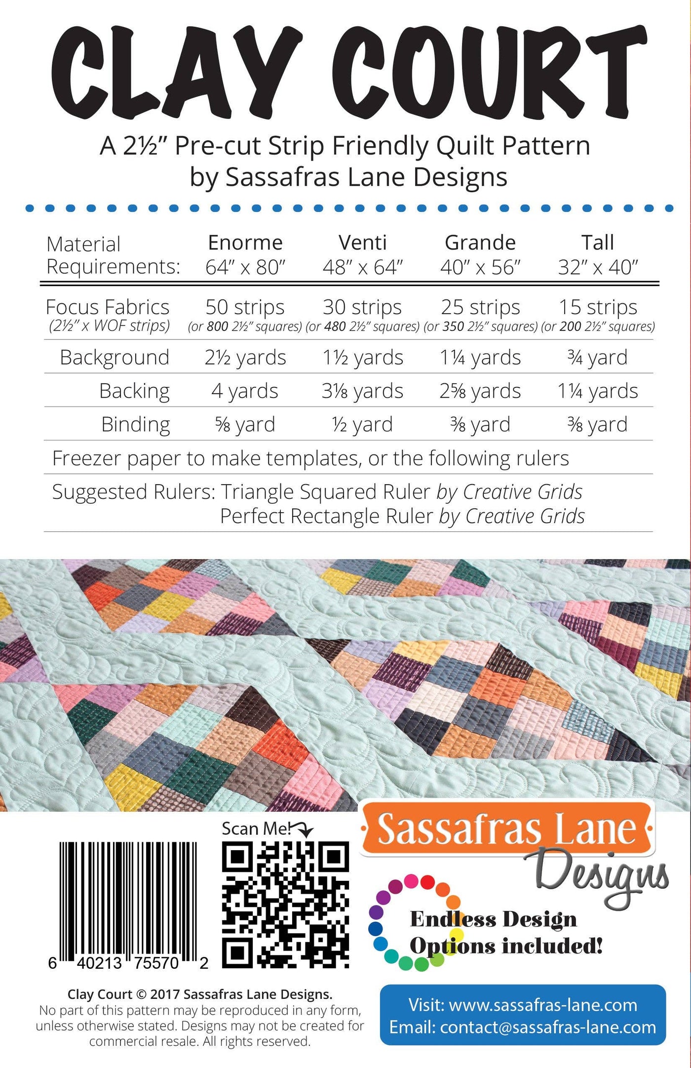 Get as scrappy as you would like with this fast and easy quilt! 3 different sizes, 2 styles and a design option with straight edges included. Feature your favorite directional prints or bust those scrap bins and make string-pieced trapezoids. Included Sizes • Tall - 36" x 48" • Grande - 48" x 66" • Venti - 66" x 84"